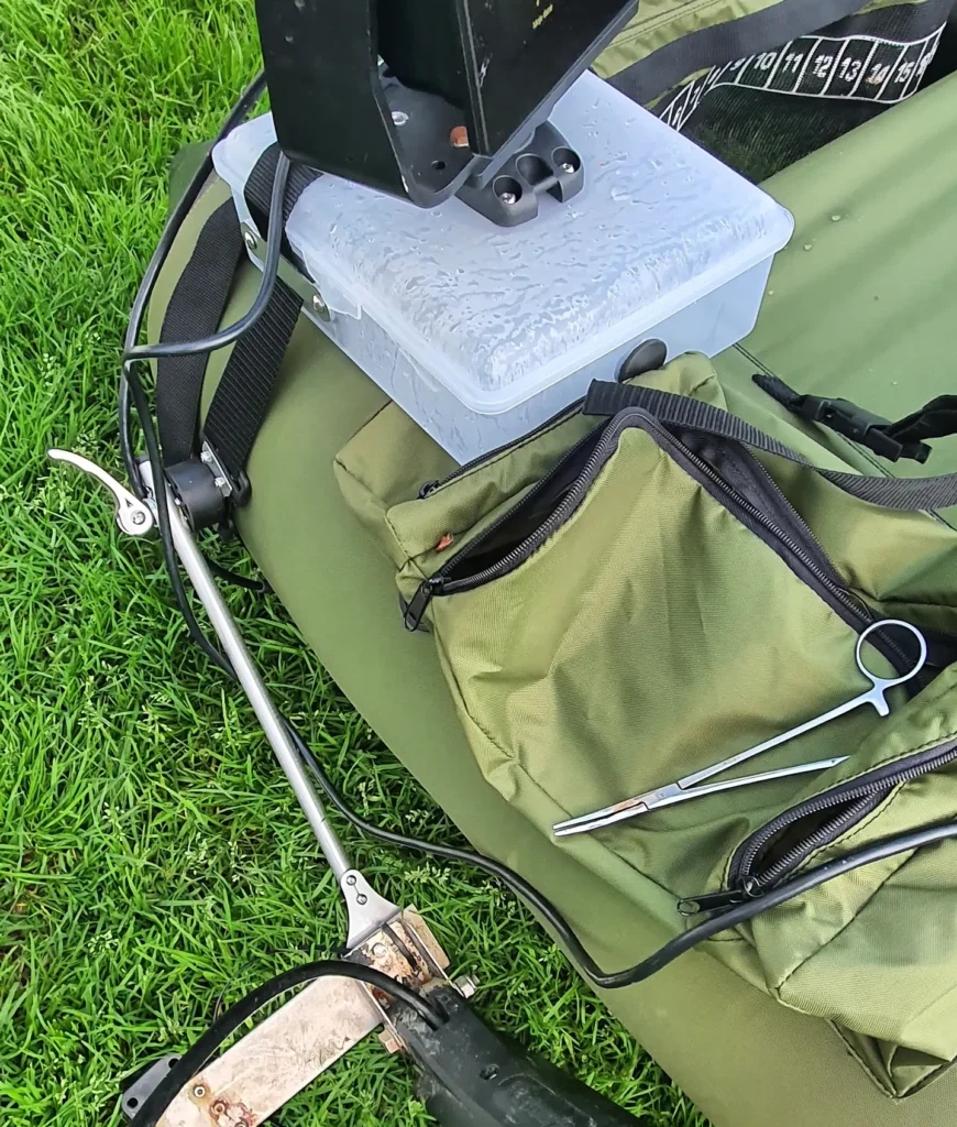 Doszły nowe ustrojstwa do mojego pływadełka 🙂 . Znalazłem trochę czasu i zacząłem uzbrajać. Dotarł do mnie uchyt na wędki i cały komplet uchwytów do montażu przetwornika i samej echosondy na belly boat.Zamontowałem mojego axioma bez problemu i jest dość wiarygodna konstrukcja. Myśle ze nie ma obaw bym mógł np utopić echosonde. Jedyny problem moze być z przetwornikiem ktory ma 700 wat i jest naprawde duży a sztyca do niego taka skromna ale zobaczymy na wodzie co i jak