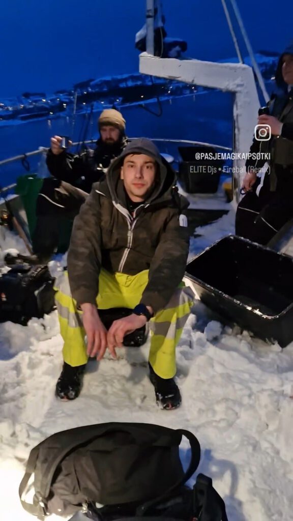 Przygotowania do wypłynięcia nie obyły się bez niespodzianek. Na pokładzie statku zastał nas widok po kolana śniegu – zapomniałem łopaty, więc musieliśmy ręcznie udeptać śnieg, by móc ruszyć w morze. Po 25 minutach dotarliśmy na wyznaczone miejsce i rozpoczęliśmy łowienie.